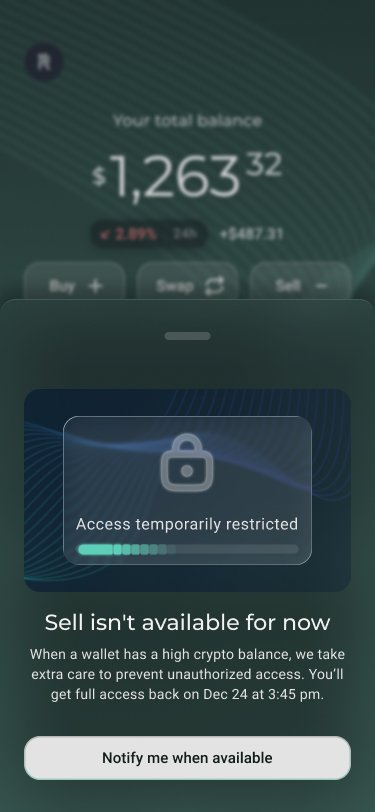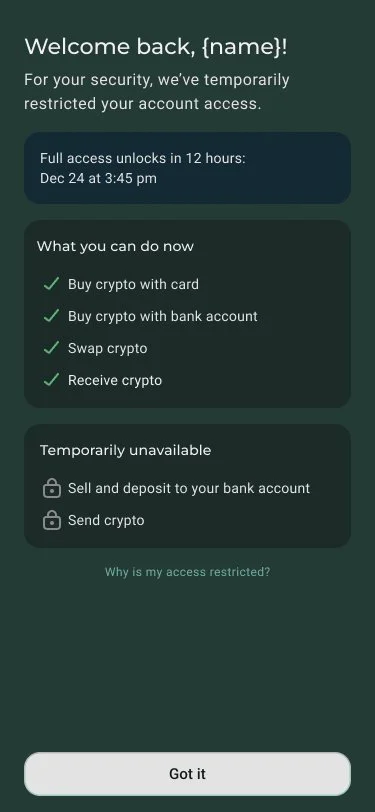 One of the more sensitive flows involved successful wallet recovery followed by temporary restrictions on high-balance accounts. The writing had to strike a very careful balance: reassure users that recovery worked, explain the temporary limitation, and frame the hold as a protective measure rather than a punishment.
