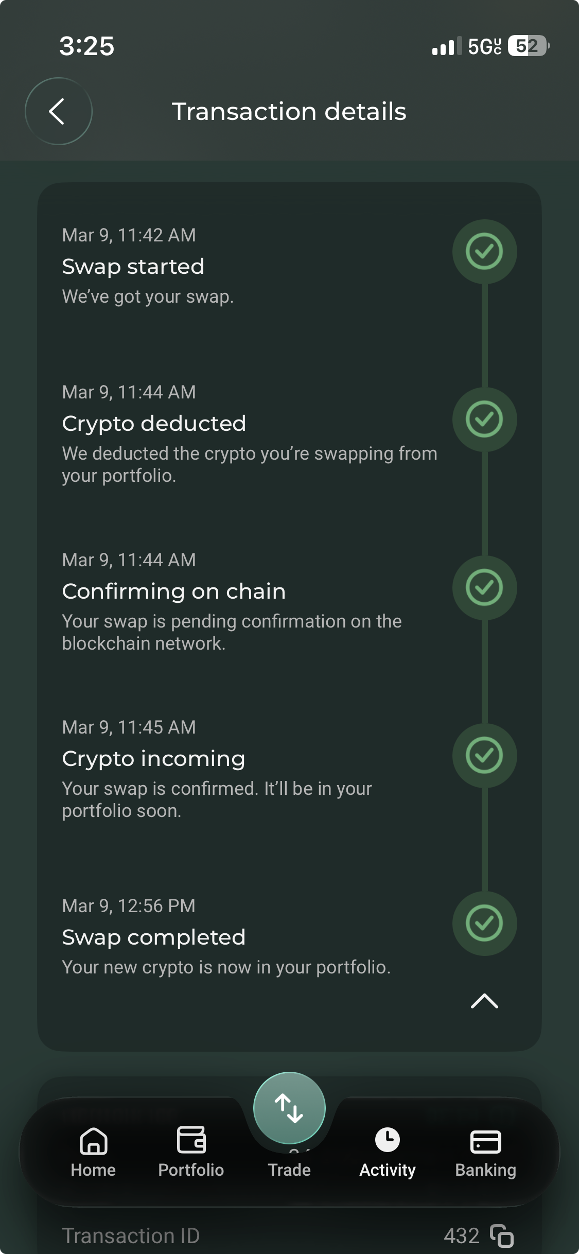 I also worked on operational states involving successful transactions, pending transactions, and payment processing delays. These moments needed especially clear status language, since users were often worried about where their money and their crypto was and whether anything had gone wrong.